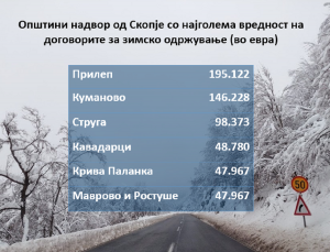 Од другите општини, најмногу пари за зимско одржување планираат да потрошат Прилеп, Куманово и Струга. Прилеп – 195 илјади евра, Куманово 146 илјади евра и Струга 98 илјади евра.