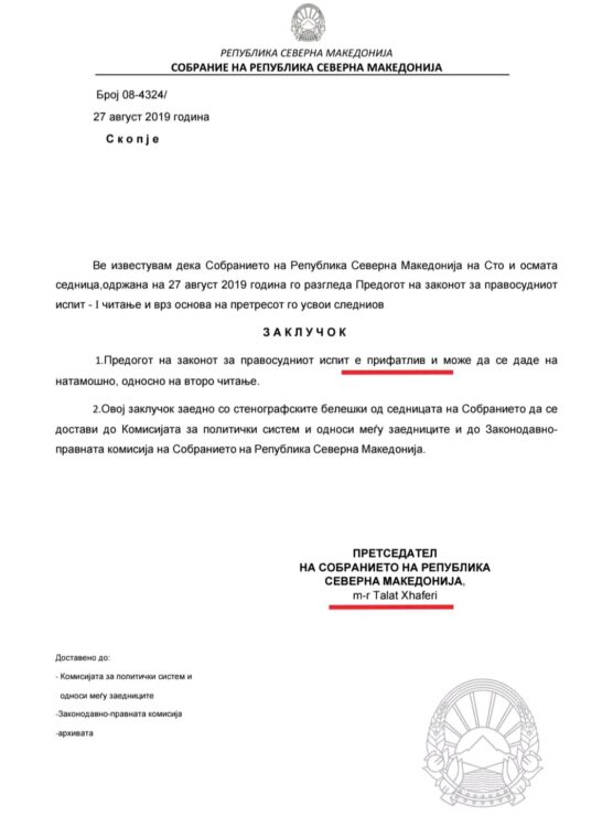 „Во тоа време, Законот за употреба на јазиците веќе беше во сила, но Талат Џафери како претседател на Собранието не побара усогласување на Законот за правосудниот испит со одредбите за албанскиот јазик. Тој го прогласи законот за прифатлив, исклучувајќи го албанскиот јазик од испитот. Уште поразочарувачки е фактот што овој закон беше изгласан со Бадентер, односно и со гласовите на пратениците Албанци од тој состав, кои имаа национална обврска да бараат испитот да се полага и на албански јазик. Тие го изгласаа законот, оставајќи денес стотици албански студенти да ги трпат последиците од една двојна неправда“, се вели во соопштението.