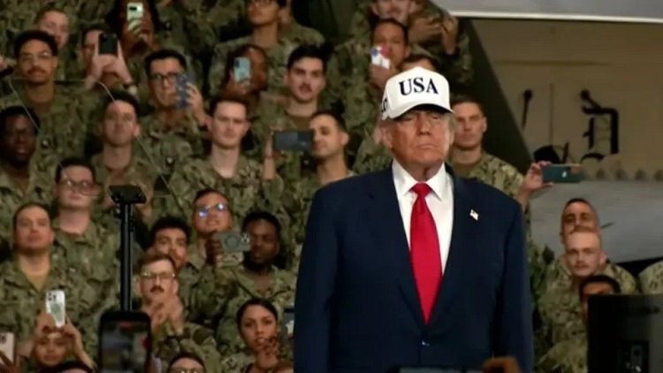 Говорејќи на палубата украсена со американски знамиња и банер со натпис „Мир со помош на сила“, Трамп нагласи дека неговата администрација нема да биде „политички коректна“ кога станува збор за одбраната на САД.