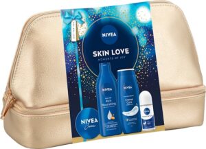 За целосна нега во еден подарок, подарок сетот NIVEA Skin Love од 915 денари нуди комплетно искуство. Гелот за туширање нежно ја чисти и хидрира кожата, млекото за тело со чист хијалурон и бадемово масло обезбедува интензивна хидратација, антиперспирантот со 0% алкохол нуди заштита до 72 часа, а универзалната крема овозможува длабока нега за сите типови кожа – сè спакувано во практична торбичка подготвена за подарок.