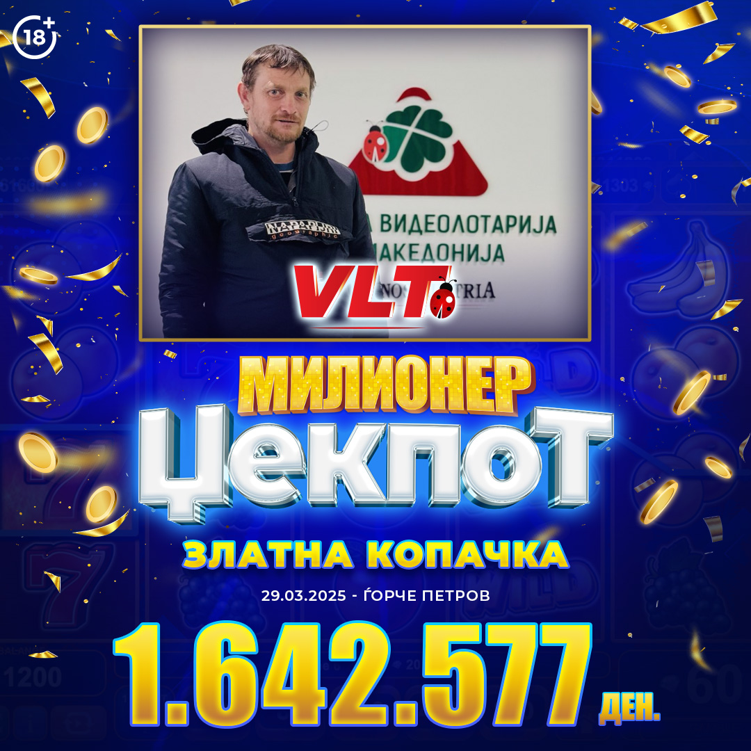 „Нашата среќна заедница се збогати со уште еден среќен играч. Благојче Василев од Скопје е среќниот добитник кој стана нов милионер. Забавувајќи се на видеолотариските терминали, тој освои МИЛИОНЕР џекпот, вреден 1.642.577 денари“, се вели во соопштението.