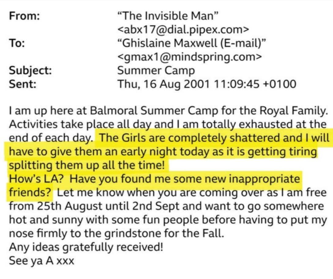 Во новие објавени досиеја на американското министерво за правда има и преписка меѓу некој потпишан како „А“ и Жилејн Максвел, клучната жена која ги врбувала жртвите во рингот на Епштајн. Останува непотврдено и нејасно дали „А“ значи „Ендру“.
