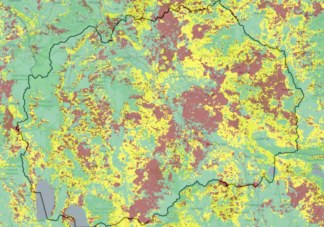 Повисоките планински предели во Македонија имаат висока сувост на вегетација(прикажана со црвено), што, велат од ЦУК, укажува на ранливост и потенцијал за појава на пожари. Мапата прикажува дека голем дел предели се средно суви(прикажано со жолто), додека во пониските предели со ниска сувост на вегетацијата, ризикот од пожар е помал.