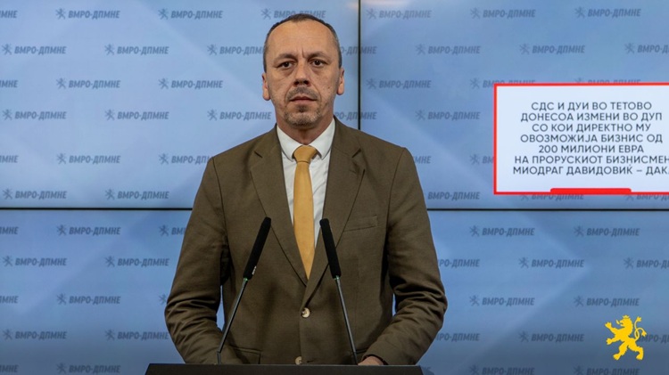 Власта на Зоран Заев и Али Ахмети, во 2020 година, на само еден ден по изборот на новата влада, во Тетово донесе измени во ДУП со кои директно му овозможи бизнис од 200 милиони евра на прорускиот бизнисмен Миодраг Давидовиќ – Дака – потсети денеска на прес-конференција пратеникот од ВМРО-ДПМНЕ Бране Петрушевски.