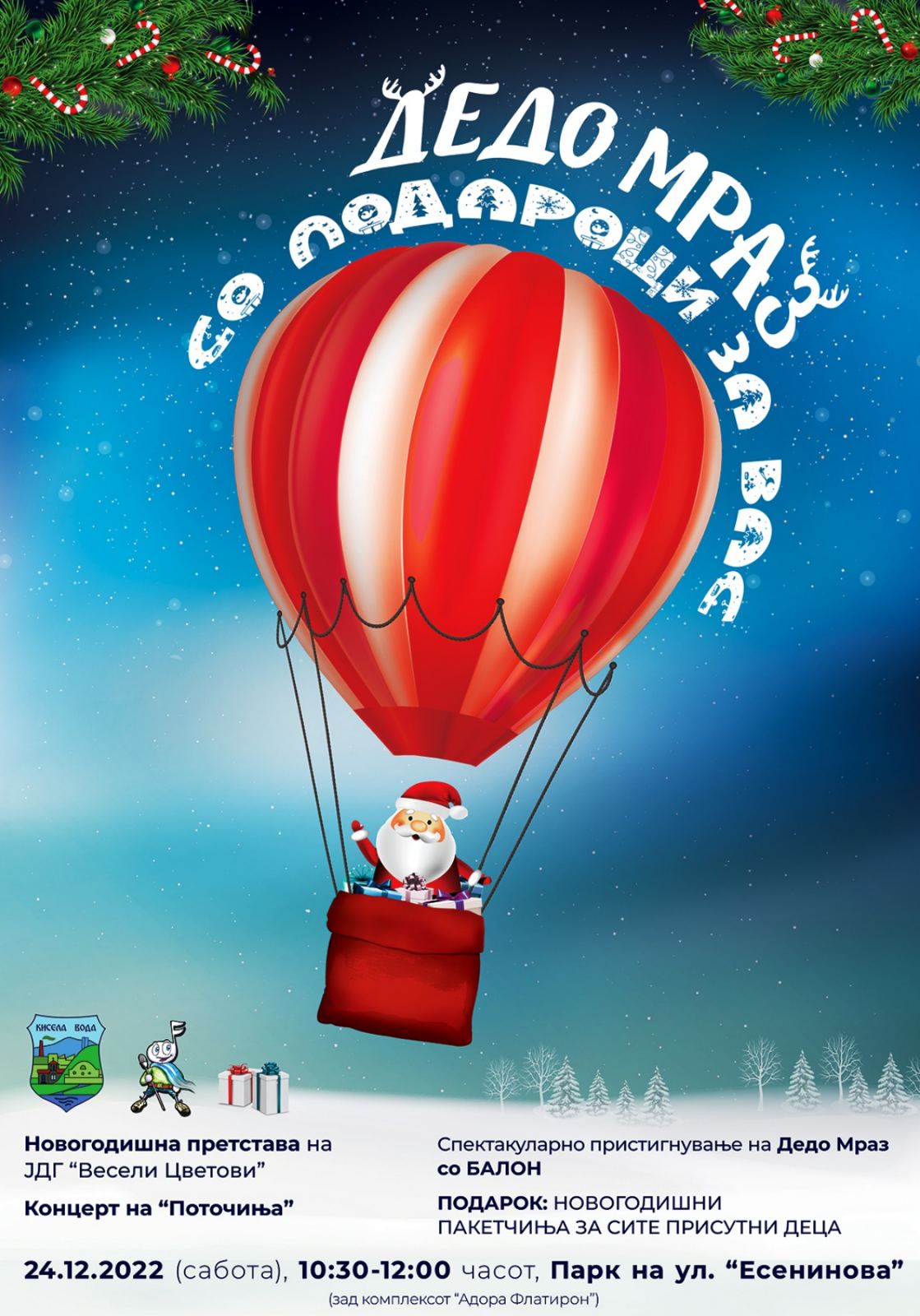 „Програмата ќе започне со театарска претстава во изведба на вработените од ЈДГ ‘Весели Цветови’, по што следува концерт на ‘Поточиња’, a потоа спектакуларно, со балон на топол воздух ќе пристигне Дедо Мраз и ќе им подели пакетчиња на сите присутни дечиња. Бидете сите во сабота, на 24.12.2022, во паркот на улицата ‘Есенинова’ за заедно да ја почуствуваме новогодишната магија и да си посакаме многу успех, среќа и здравје во Новата 2023 година!“, се вели во поканата.
