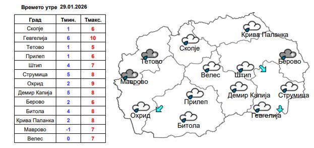 Во Скопје времето ќе биде облачно и магловито, а попладне со повремен дожд. Ќе дува слаб променлив ветер. Температурата ќе се движи од 1 до 6 степени.