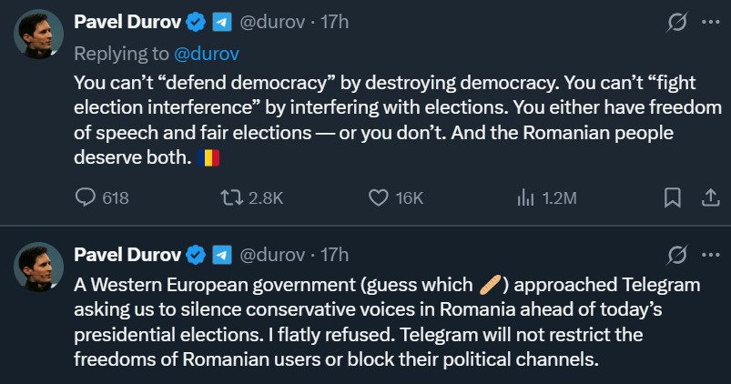 Основачот на Телеграм Павел Дуров вели дека одбил барање на Франција неговата социјална мрежа „да ги замолчи конзервативните гласови во Романија пред почетокот на вториот круг од претседателските избори“.