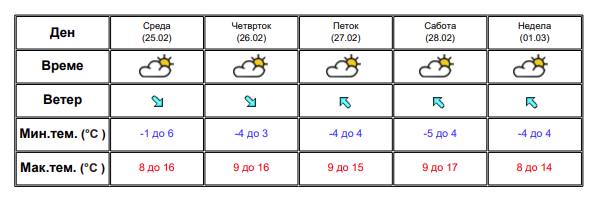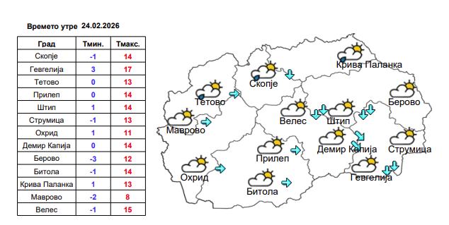 Најстудено ќе биде во Берово, со утринска температура од минус 3 степени. Најтопло ќе биде во Гевгелија, со максимална дневна температура до 17 степени.