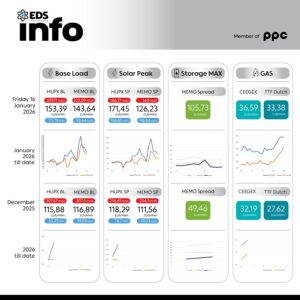 Согласно податоците за движењето на цените на берзата HUPX во Унгарија за 16 јануари 2026 просечната часовна цена на еден мегават час електрична енергија (baseload) изнесува 153,39 евра/mwh, додека на Македонската берза за електрична енергија цената е 143,64 евра/mwh