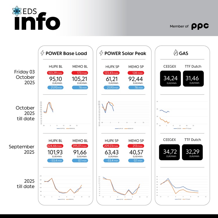 Просечната цена на електричната енергија за петок, 3 октомври 2025 година, на берзата HUPX во Унгарија изнесува 95,10 евра за мегават час, додека на Македонската берза за електрична енергија – МЕМО, цената достигна 105,21 евра за мегават час, информираат од компанијата ЕДС преку нивниот Инфо поинт.