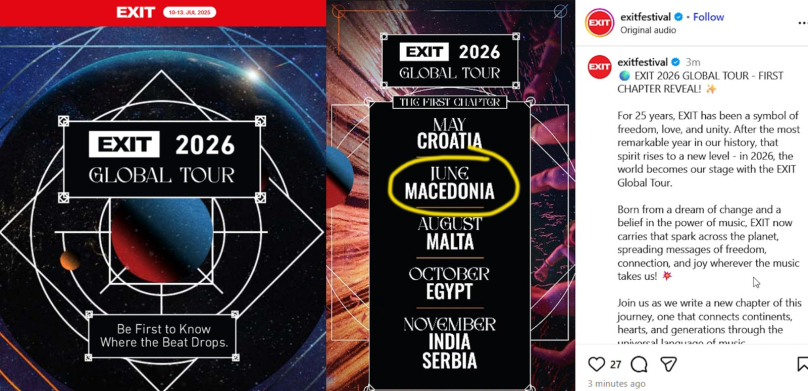 Според објавата на официјалниот Instagram профил на EXIT, првите дестинации за 2026 Exit Global Tour година се Египет, Индија, Малта, Хрватска, Македонија и Србија.