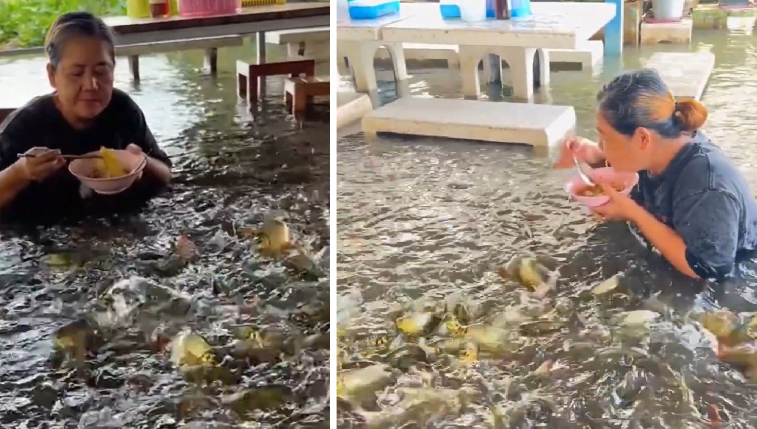 🍜 タイ中部の複数の県が深刻な洪水に見舞われたが、このレストランのオーナーは細かいことは気にせず、食事を楽しむことに決めたようだ。近づいてくる魚たちにも食事を振る舞った。