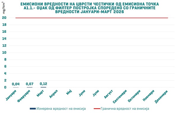 Измерените вредности во овој период не се само „под граница“, туку се драстично пониски од дозволените. Кај емисионата точка A1.1 – Oџак од филтер постројка, измерените вредности изнесуваат 0,04 милиграми на нормален метар кубен (mg/Nm³) во јануари, 0,07 mg/Nm³ во февруари и 0,12 mg/Nm³ во март, што е далеку под граничната вредност од 20 mg/Nm³.