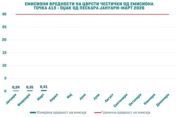 Кај емисионата точка A13 – Оџак од пескара, измерените вредности се 0,24 mg/Nm³ во јануари, 0,31 mg/Nm³ во февруари и 0,41 mg/Nm³ во март, при дозволена гранична вредност од 30 милиграми на нормален метар кубен (mg/Nm³).
