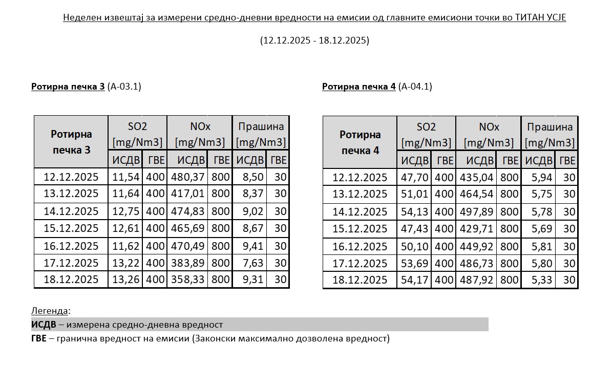 Емисиите од работата на ТИТАН УСЈЕ постојано се под граничните вредности определени со Закон, соопшти ТИТАН УСЈЕ приложувајќи табела од дневните мерења за денеска, 19 декември.