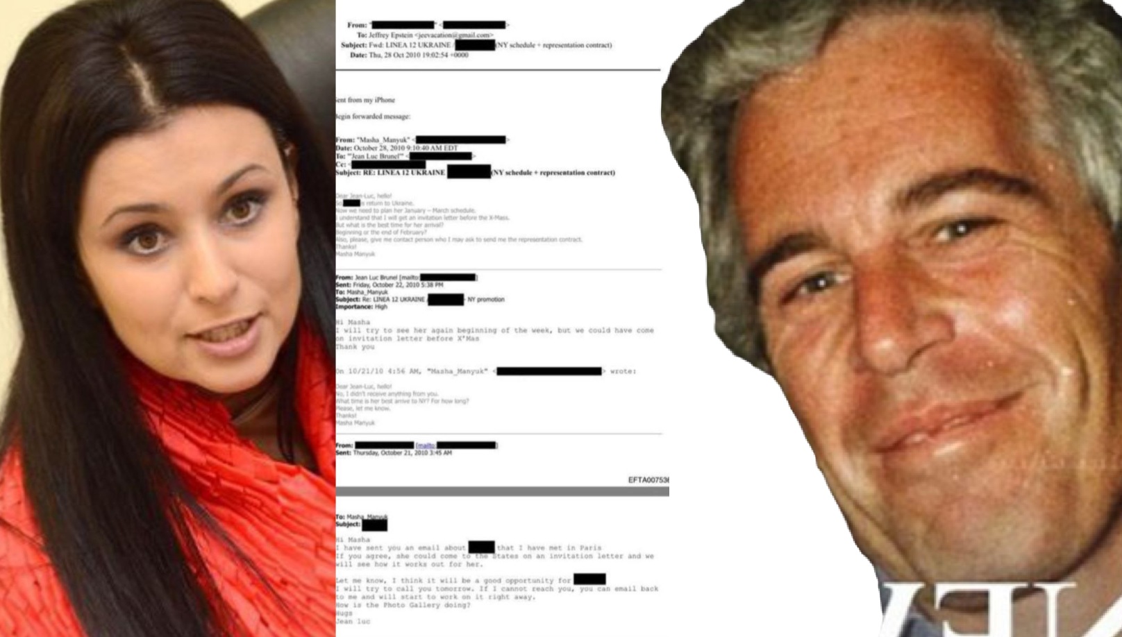 Електронската преписка наведува контакти со две модни агенции од Киев. Во една порака анонимен испраќач ги оценувал како „најдобри“, со дополнување дека други мали агенции биле „евтини ескорт агенции“, со најава дека ќе се најдат контакти ако е потребно. Во истата нишка се разменувале фотографии, со селекција на жени што му се допаѓале на Епстин.