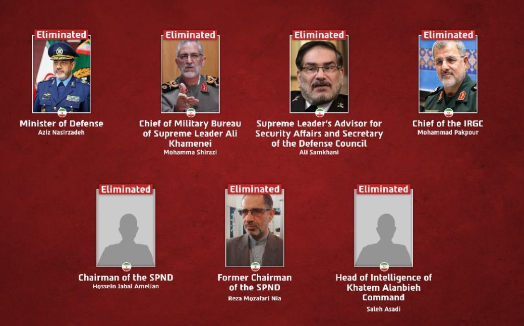 Иран претрпе сериозни загуби и во военото раководство. Убиени се командантот на Револуционерната гарда Мохамед Пакпур, министерот за одбрана Азиз Насирзаде и началникот на Генералштабот Абдолрахим Мусави.