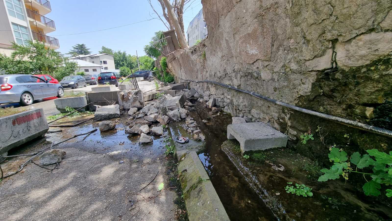 – Пред околу една ипол година стигнаа пријави од граѓани дека постои опасност да падне потпорниот ѕид кој е на улицата над Клиниката за детски болести на улицата Мајка Тереза. Ги известивме сите надлежни институции, Министерството за здравство, градот Скопје, општината Центар и МВР и други институции. За жал година ипол подоцна не е преземено ништо. Состојбата со ѕидот е влошена. Утрово добивме пријава дека дел е срушен. Прашање е на време кога ќе се сруши остатокот. Меѓу другото, под ѕидот се паркираат возила и минуваат лица кои се движат во кругот на државната болница. Апелираме до општина Центар и градот да се зафатат со санирање на проблемот. Итно да се зафатат со решавање на проблемот. Пролемот е комплексен затоа што на самата улица Белградска која го разграничува Клиничикиот центар од куќите кои се наоѓаат над него, постои систем на канали и шанси кои се во лоша кондиција, не собираат вода кој надоаѓа од падините на Водно. Сопственоста не може да ја утврдиме. Во најлошо сценарио можно е возилата кои возат по два правци кои едвај се разминуваат и да има трагедија во која ќе бидат опфатени и возила. Во опасност се човечки животи, здравје, но и човечки имот, мислејќи на паркираните возила – велли Ангелов.