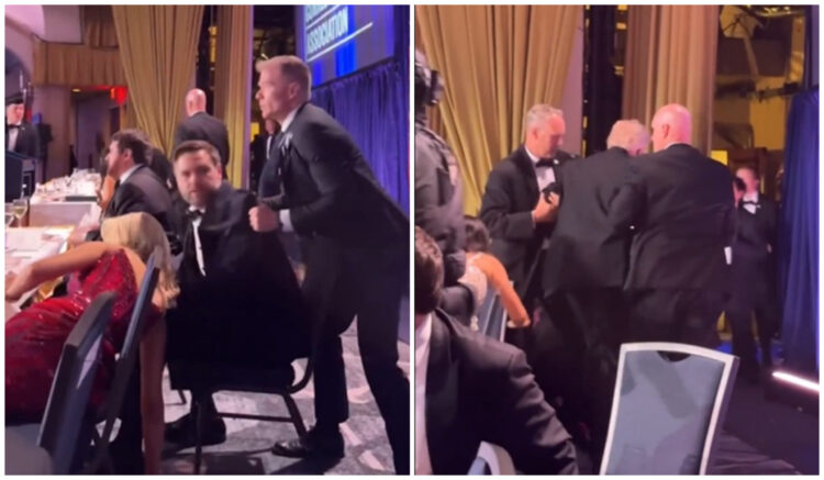 President Trump and Vice President JD Vance were rushed off the stage after shots were fired at the White House Correspondents’ Dinner.#news pic.twitter.com/YQuG8gzTMf