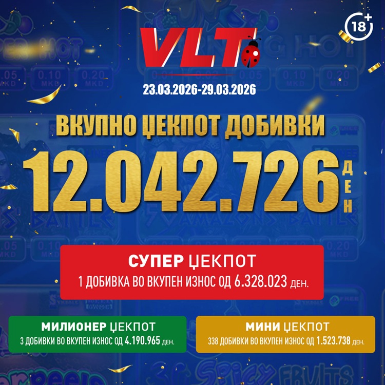 Во периодот од 23.03.2026 до 29.03.2026 година, Видеолотарија Касинос Австрија исплати вкупно 12.042.726 денари кон играчите на ВЛТ терминалите низ Македонија, и тоа:
