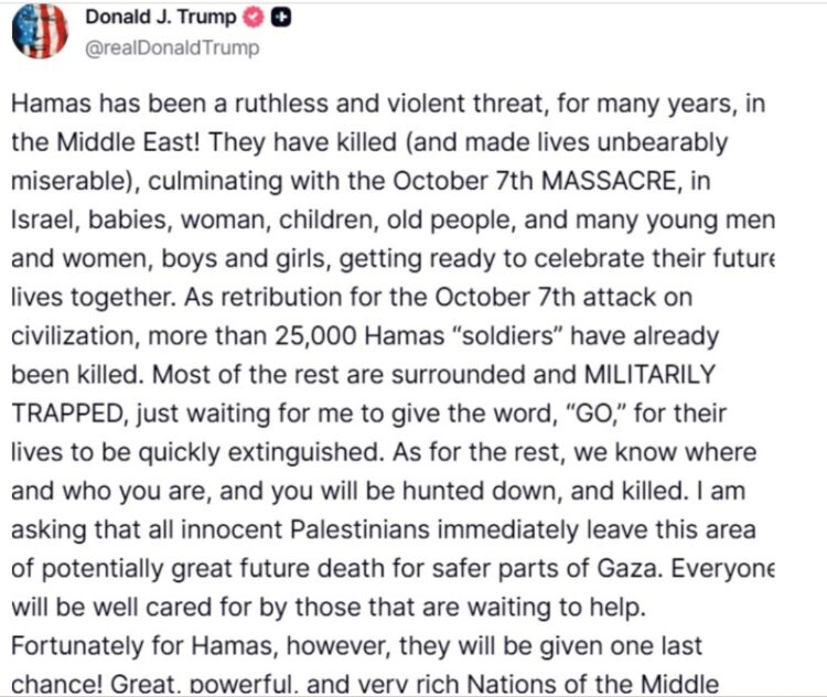 „Хамас е немилосрдна и насилна закана на Блискиот Исток со години! Тие убиваат (и го прават животот неподнослив), што кулминира со МАСАКРОТ на 7 октомври во Израел – бебиња, жени, деца, стари лица и многу млади мажи и жени, момчиња и девојчиња кои се подготвуваа да го прослават својот иден живот заедно. Како одмазда за нападот врз цивилизацијата на 7 октомври, повеќе од 25.000 „војници“ на Хамас веќе се убиени. Повеќето од другите се опкружени и воено опколени, тие само чекаат да им го кажам зборот „ОДИ“ за брзо да им се згасне животот“, наведува Трамп во својата остра објава до палестинската милитантна група.