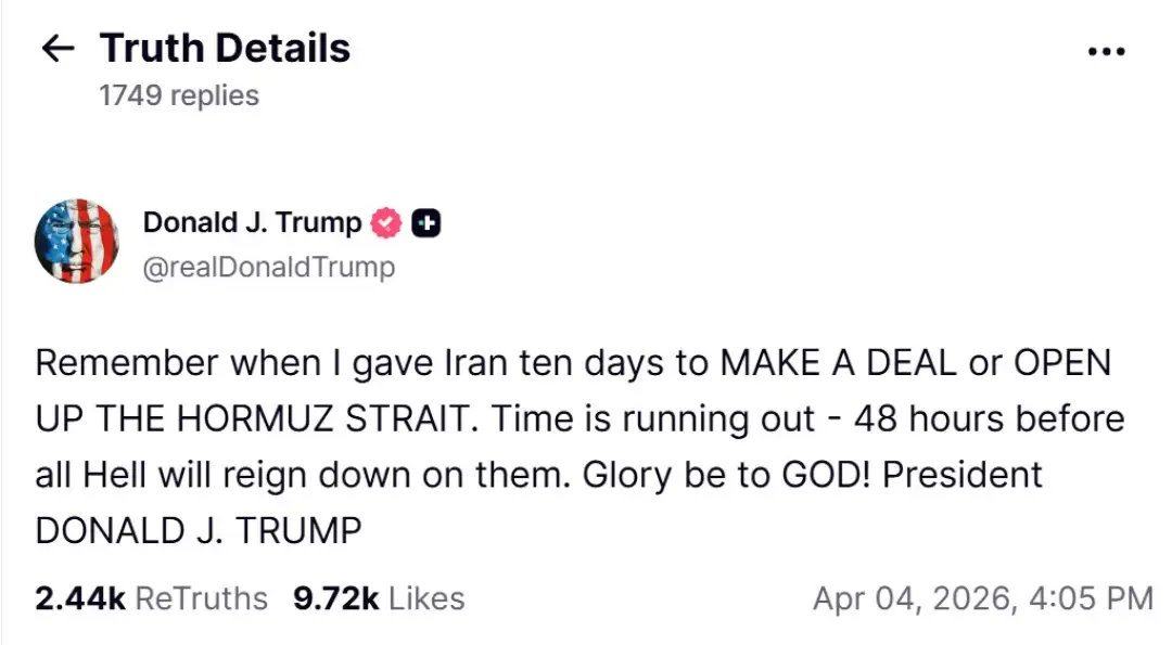 – Се сеќавате дека му дадов на Иран десет дена да склучи договор или да ја отвори Ормуската Теснина. Времето истекува – уште 48 часа пред целиот пекол да се урне врз нив. Слава му на Бога, напиша Трамп.