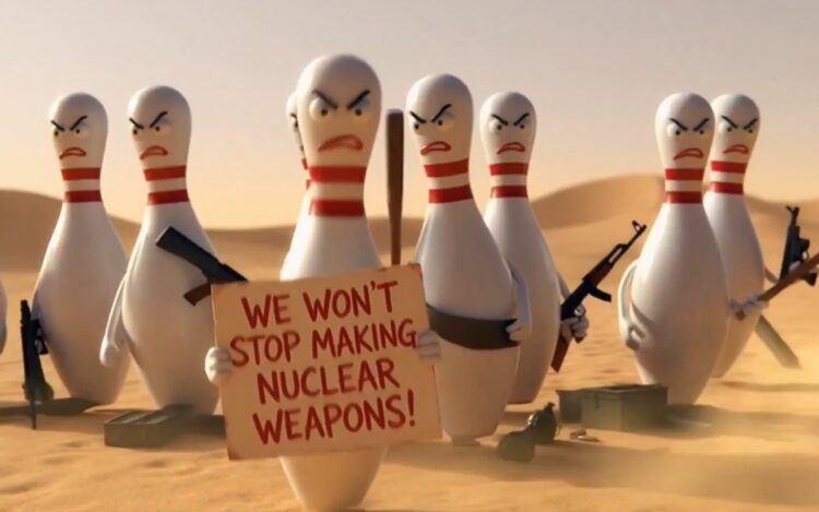 Видеото од приближно 34 секунди користи метафора со куглање: иранските функционери се прикажани како кегли, а Американците се како топка што ги урива.
