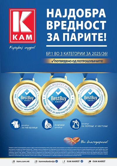 КАМ, македонскиот маркет број еден, кој е носител на престижното признание „Best Buy“ за најдобар сооднос помеѓу цена и квалитет за 2025/2026 во категоријата малопродажни синџири, неодамна доби уште три нови награди со кои продолжува да ги потврдува своите високи стандарди. Компанијата се здоби со нови признанија „Best Buy” за најголема вредност за потрошените средства кои ги доделува реномираната меѓународна агенција ICERTIAS, со седиште во Цирих, Швајцарија. Агенцијата преку истражување на пазарот и независна евалуација им помага на потрошувачите да откријат производи и услуги со исклучителен сооднос помеѓу цена и квалитет и со тоа го подобрува секојдневниот живот на граѓаните.