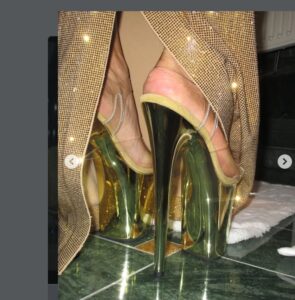 Во претесен, златен фустан што ја истакнуваше нејзината фигура, но и ѝ го отежнуваше одењето, Ким едвај се движеше на вртоглаво високите штикли.