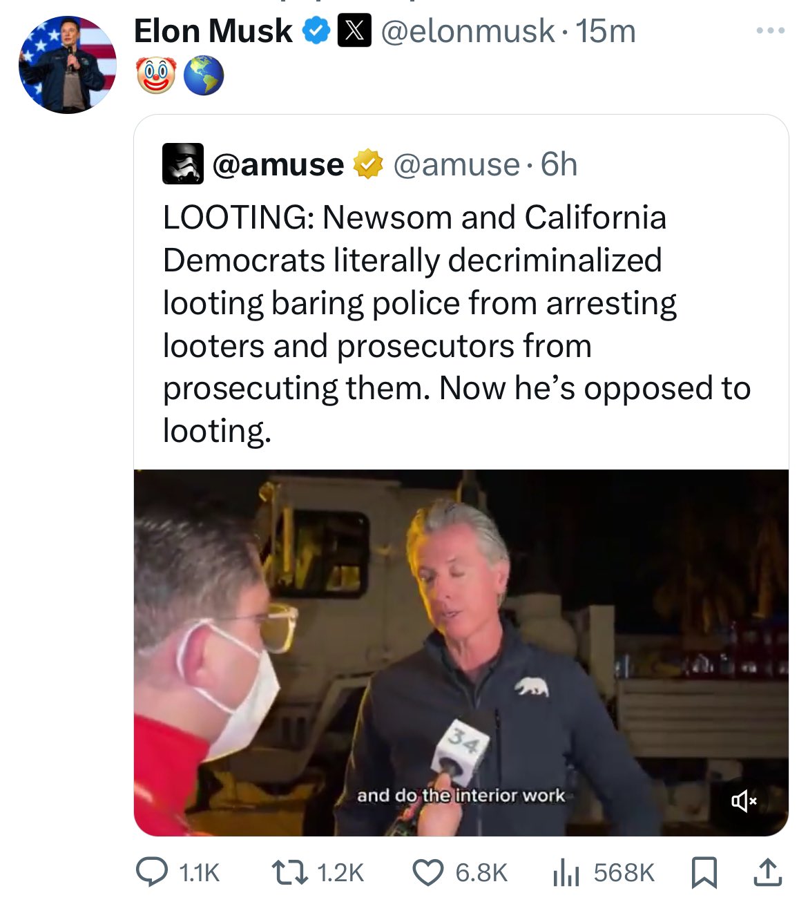 Престанете да охрабрувате грабежи со лажење и велејќи им на луѓето дека е декриминализирано. Не е. Тоа е нелегално – е како што и секогаш било, му одговори гувернерот на Калифорнија на познатиот техномилијардер Илон Маск.