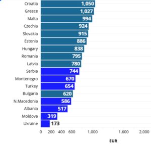 Меѓу земјите-членки на ЕУ, месечната бруто минимална плата се движи од 620 евра во Бугарија до 2.704 евра во Луксембург. Кога се вклучени земјите-кандидатки, Украина значително отстапува со износ од 173 евра, по што следува Молдавија со 319 евра.