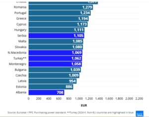 Освен Албанија, земјите-кандидатки за ЕУ имаат подобри резултати во однос на PPS, со поголема куповна моќ.