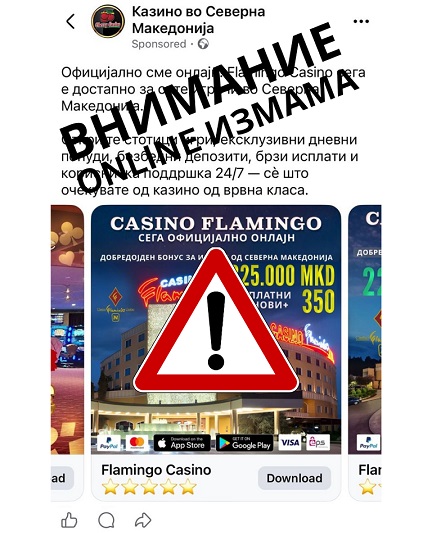 Сакаме јасно да ставиме до знаење дека казината „Фламинго“ (Гевгелија и Скопје), „Гранд Казино Адмирал“, „Луксор“, како и автомат клубовите „Астра“, „Адмирал“, „Апекс“, „Моцарт“ и „Спортлајф“ не приредуваат онлајн игри на среќа согласно македонското законодавство за приредување игри на среќа! Лажните вести, кои измамнички го рекламираат спротивното се обид за злоупотреба на корпоративен углед на нашите членки. Оттука, добронамерно им препорачуваме на нашите посетители да се информираат од официјалните комуникациски канали на нашите членки“, се наведува во соопштението од АПИС.