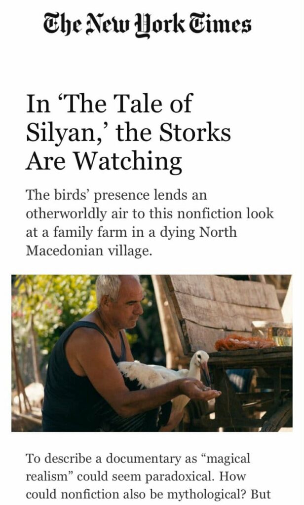 „Филмот на Котевска од 2019 година, „Медена земја“, првиот што доби номинации за Оскар и во меѓународната и во документарната категорија, исто така, ги разгледа начините на кои промените во животната средина, традиционалното земјоделство и миграцијата беа испреплетени во рурална Македонија. Тој филм имаше соновна атмосфера што се пренесува и на „Приказната за Силјан“, но овој има чудна дивост, благодарение на присуството на штрковите. Тие изгледаат како уште еден збир жители во селото, особено затоа што човечката популација се чини дека постојано се намалува. Штрковите постојано гледаат, како духови, со нивните издолжени пропорции и вратови што можат целосно да се свиткаат наназад“, пишува Вилкинсон.