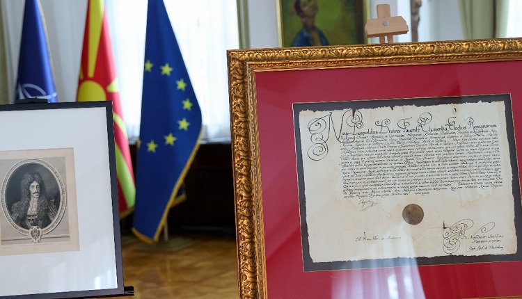 Професор Георги Гоце Дуртаноски, експерт за христијанска палеографија, денеска ѝ врачи на претседателката Гордана Сиљановска-Давкова во нејзиниот кабинет копија од Привилегијата издадена на Македонците од Светиот римски цар Леополд Први Хабзбуршки во 1690 година во Виена.