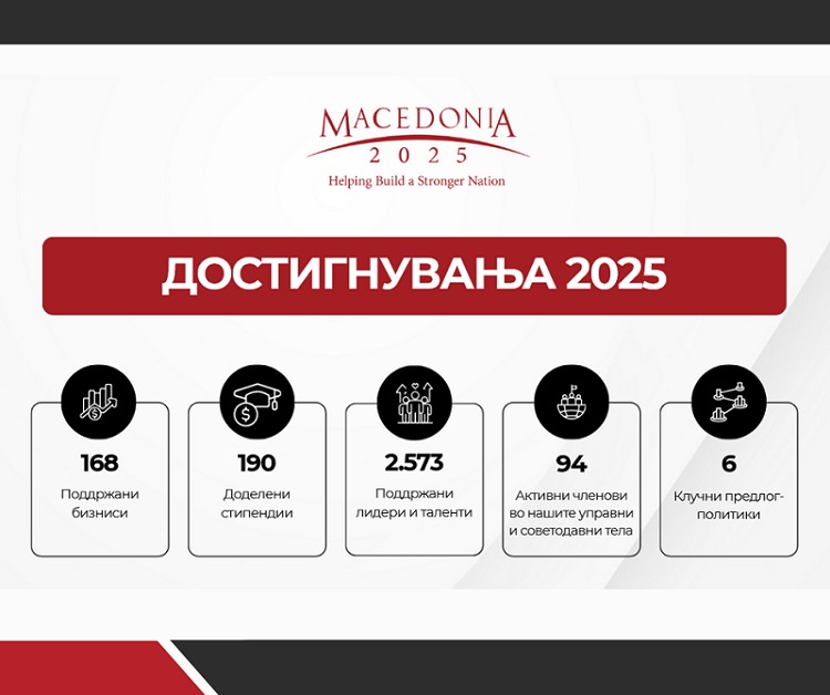 Македонија2025 ги објави резултатите од својата работа во 2025 година, при што организацијата постигна рекордни успеси во поддршката на економскиот развој, лидерството и глобалната поврзаност на земјата. Во 2025 година, Македонија2025 имплементирала повеќе од 40 програми и иницијативи со кои се поддржани 168 компании, доделени се 190 стипендии за едукација и усовршување, а 2.573 лидери и таленти биле директно опфатени со програмите за развој. Организацијата исто така бележи значително зголемување на својот општествен импакт, со 94 активни членови во управните и советодавните тела и развиени шест клучни предлог-политики кои веќе се интегрираат во национални стратегии и реформски процеси.