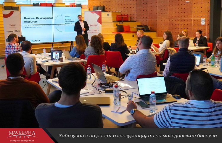 Паралелно, Македонија2025 продолжи континуирано да ја зајакнува бизнис-заедницата и човечкиот капитал преку програми насочени кон модернизација, дигитална трансформација и развој на лидерски компетенции. Преку Центарот за дигитална трансформација – GoDigital беа изработени 30 детални проценки на дигитална зрелост, 15 дигитални стратегии за компании и беше обезбедена практична техничка поддршка за пет компании во процесот на имплементација на нови дигитални решенија. Овие услуги им помогнаа на фирмите да го подигнат својот степен на конкурентност, да ги оптимизираат процесите и да воведат алатки што ја забрзуваат нивната интеграција во современите економски текови. Воедно, 553 професионалци и менаџери посетуваа специјализирани обуки, работилници и вебинари, со што се создаде поширока заедница на практичари кои активно ја применуваат стекнатата експертиза во своите организации. Како дел од напорите за градење силна генерација претприемачи, 27 млади менаџери и основачи на компании го надградија своето бизнис знаење преку реномираната обука што ја спроведе канадската Ајви бизнис школа во рамки на проектот „Лидер“, со што мрежата на алумни се прошири на 451 член.