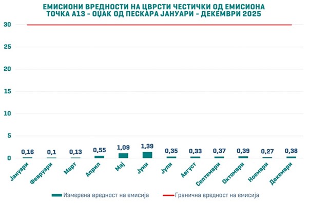 Според редовниот мониторинг на емисиите, кој се спроведува согласно методологии за мерење на стационарни извори, измерените вредности на цврсти честички за месеците октомври, ноември и декември 2025 година покажуваат конзистентно исклучително ниски вредности, кои се во согласност со одредбите од А-интегрираната еколошка дозвола издадена од Министерството за животна средина и просторно планирање, како и релевантната законска легислатива.