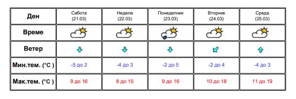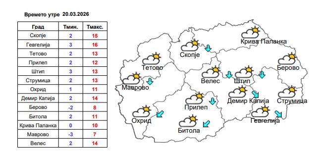 Во Скопје времето ќе биде претежно облачно со повремени сончеви периоди. Ќе дува умерен повремено засилен ветер од северен правец. Температурата ќе се движи од 2 степена наутро, до 15 степени преку денот.