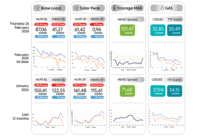 Просечната цена на струјата на унгарската HUPX берза за 26 февруари 2026 изнесува 87,06 евра за мегават час, додека на македонската берза МЕМО 41,27 евра за мегават час, соопшти компнаијата ЕДС Инфо Поинт.