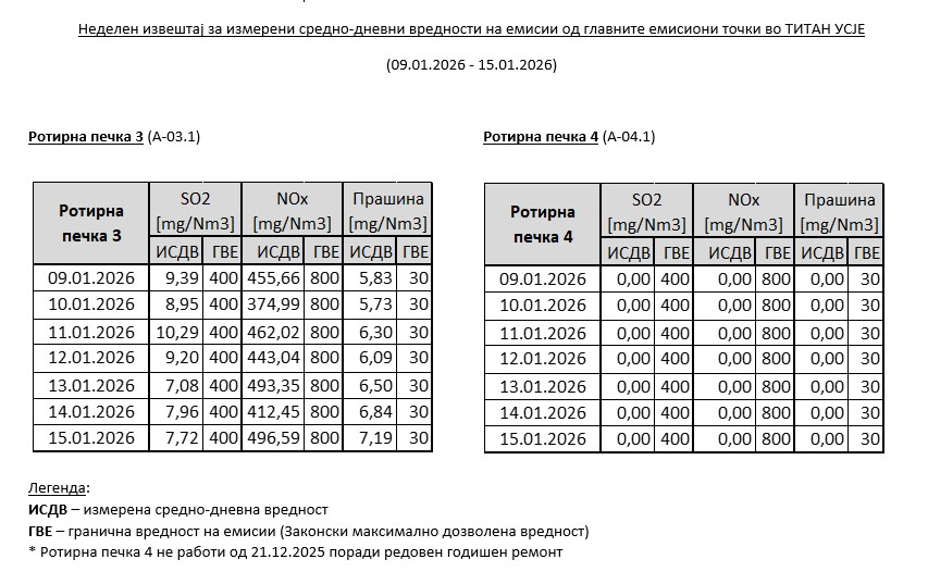 Имено, согласно домашната регулатива, која во овој сегмент е идентична со онаа на Европската унија, ТИТАН Усје како компанија носител на А-интегрирана дозвола, е под континуиран 24-часовен независен мониторинг на излезните гасови од оџаците, а резултатите од мерењата се јавно достапни (неделен извештај даден во прилог). Граничните вредности на емисиите утврдени во дозволата која ја поседува ТИТАН Усје се построги од оние пропишани со Законот. И покрај тоа, компанијата, во своето работење, не ги надминува вака дефинираните дозволени гранични вредности. Тоа е овозможено со високоефикасен, комплексен систем на современи филтри кои фабриката ги има инсталирано и задолжително работат секогаш кога работат и производните линии. Покрај тоа компанијата континуирано инвестира во модернизација на технолошките процеси. Имено, во изминатите шест години инвестициите надминаа 36 милиони евра, од кои 4,5 милиони евра беа наменети за унапредување на заштитата на животната средина.