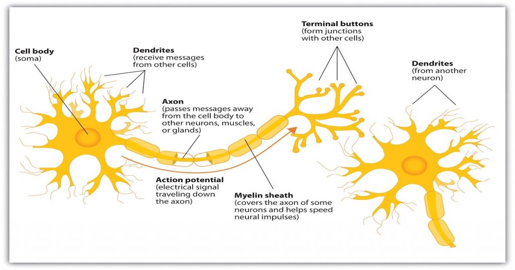 Кога мозочната клетка пренесува сигнал до друг неврон, тоа го прави преку синапса, односно точка на контакт помеѓу аксоните на една клетка и дендритите или аксоните на друга. Што е аксон или како изгледаат делови од нервна клетка, можете да видите на сликата подолу.