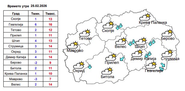 Во Скопје времето ќе биде сончево, со мала до умерена облачност. Ќе дува слаб до умерен, а во делови од котлината повремено засилен ветер од северен правец. Температурата ќе се движи од 1 до 13 степени.