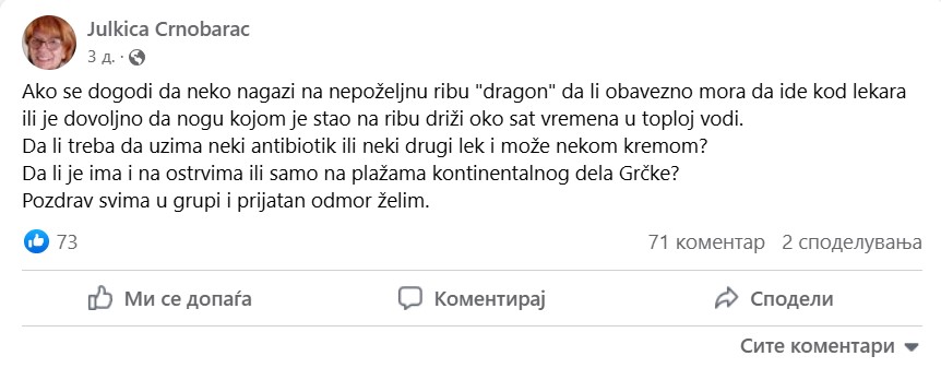„Мојот син имаше лошо искуство на Јадранот на 15 години. Го убоде додека ја симнуваше од јадицата, не знаеше дека тоа е таа риба… Отокот беше ужасен, болката беше неподнослива, веднаш моравме да одиме на доктор“, пишува таа.