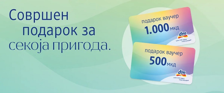Ваучерот може да се искористи во сите dm продавници, каде што има избор од над 14.000 производи за нега, убавина, здравје и секојдневна грижа.
