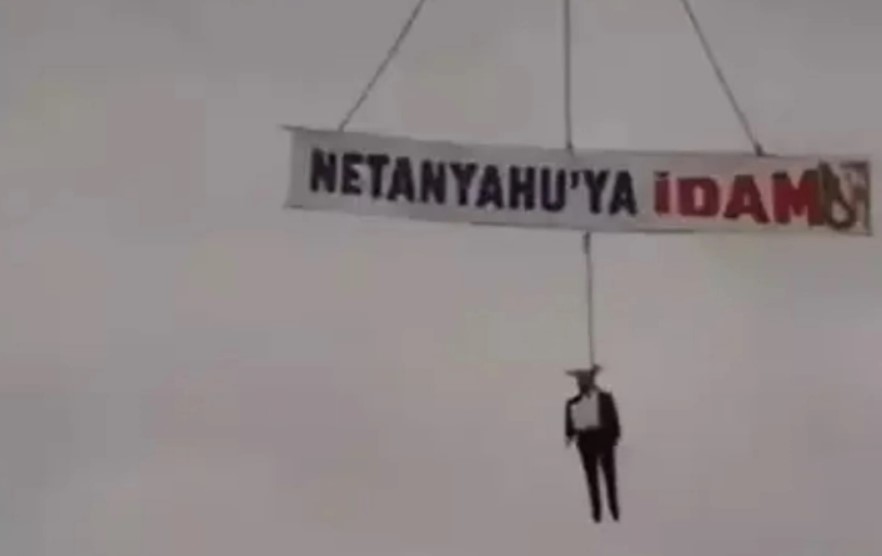 Фотографиите објавени од турскиот провладини весник „Јени Сафак“ покажуваат кукла како виси од кран во градот Трабзон на Црното Море. Над неа, на постер пишува „Смртна казна за Нетанјаху“.