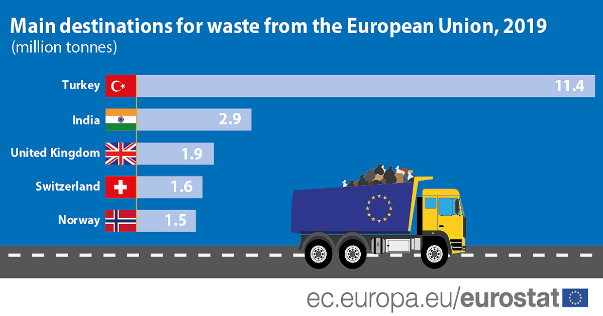 Турција е најголемата дестинација за отпад што се извезува од ЕУ со волумен од околу 11,4 милиони тони во 2019 година. Ова е скоро три пати повеќе од 2004 година. Индија е втора по големина дестинација, со скоро 2,9 милиони тони ѓубре од Унијата во 2019 година, а потоа следат Велика Британија со 1,9 милиони тони, Швајцарија со 1,6 милиони тони и Норвешка со 1,5 милиони тони.