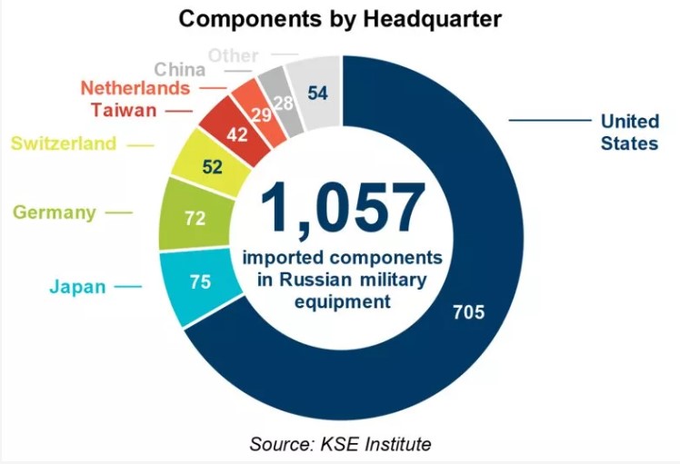 Од 155 компании чии критични компоненти биле идентификувани во руската воена опрема, 59 биле од компании со седиште во САД, покажуваат трговските податоци од украинските власти од Институтот КСЕ.