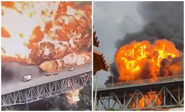 Шокантните снимки од безбедносните камери го забележаа моментот на експлозијата, додека пламените јазици го зафатија мостот во еден миг. На видеата се гледаат возила на мостот кои се обидуваат да избегаат од пожарот.