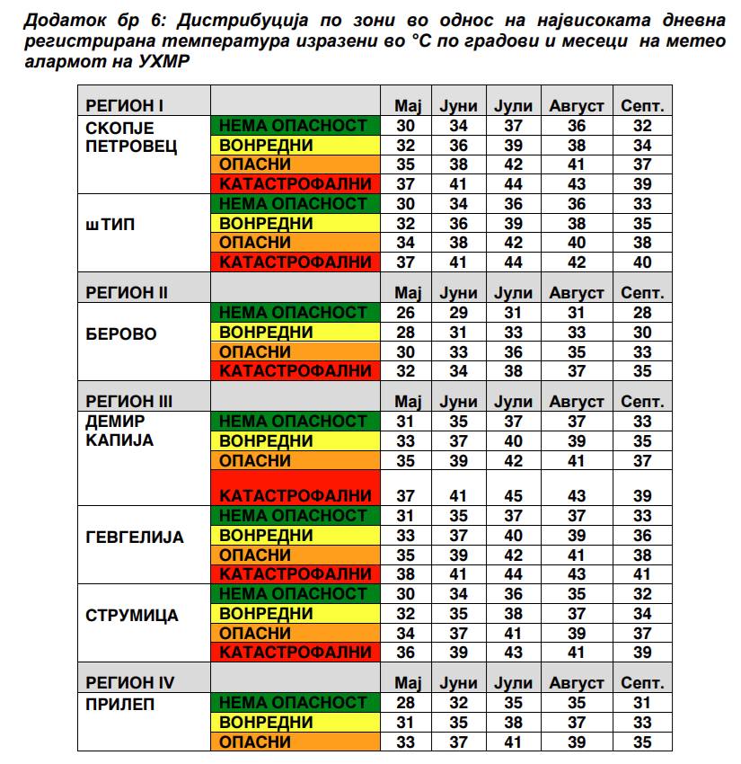 Температурата од 43 степени за периодот на август за регионот на Скопје и Петровец спаѓа во категоријата катастрофални температури означени со црвено, која е највисоката категорија по „опасни температури“ означени со портокалово кои почнуваат со 41. степен, вонредните со жолто од 38 степени, додека температура од 36 степени во август за Скопје е карактеризирана како неопасна.
